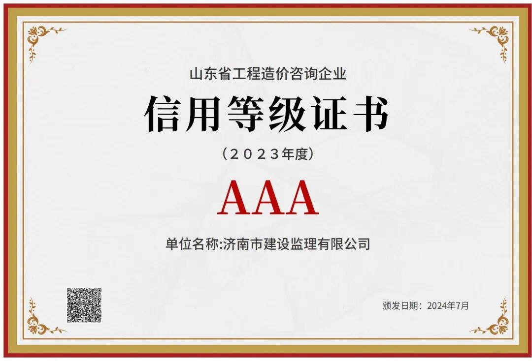 喜報!濟南監(jiān)理獲評2023年度山東省工程造價咨詢企業(yè)信用等級評價AAA等級